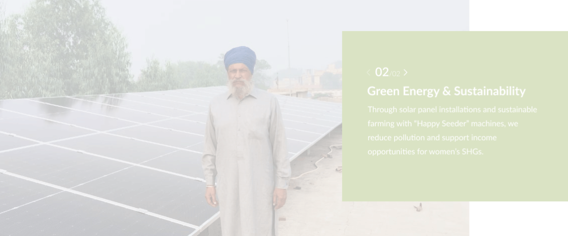 Through solar panel installations and sustainable farming with “Happy Seeder” machines, we reduce pollution and support income opportunities for women’s SHGs.